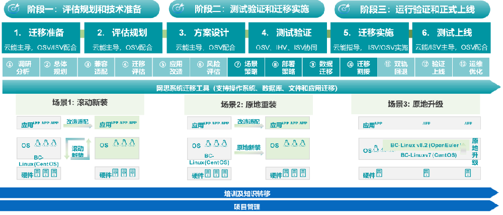 网思科技Linux迁移工厂团队根据移动云系统迁移需求,结合网思在云能长期服务、特别是带外监控和装机服务中对于移动云的了解,制定了本次移动云迁移的三个阶段、六个环节、13个步骤工程实施方法及三种迁移类型的技术方案