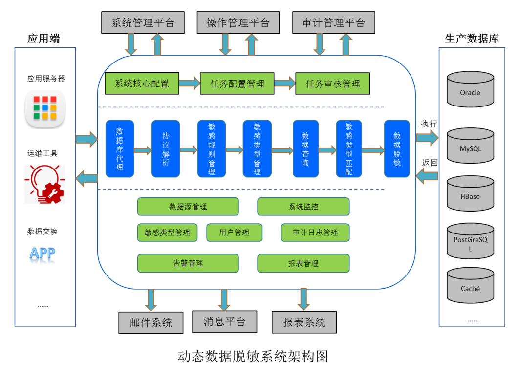 针对需要实时处理的数据应用场景。对生产库返回的数据进行实时脱敏处理,确保返回数据可用而安全。例如应用需要呈现部分数据,但是又不希望应用账号可以看到全部数据;运维人员需要维护表结构,进行系统调优,但是不希望运维人员可以检索或导出真实数据,动态脱敏可以概括为“边脱敏,边使用”。