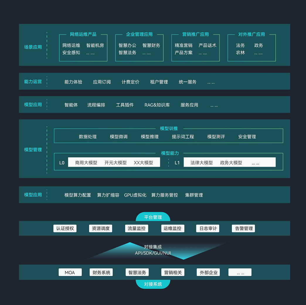 AlphaMind® 大模型管理平台(MaaS)具备数据管理、微调训练、推理部署、应用开发、能力服务等功能,基于多种开源或 闭源大模型及Agent、RAG框架进行场景化的应用开发、部署和运营管理,从而支撑需求场景,实现对内赋能,对外变现。